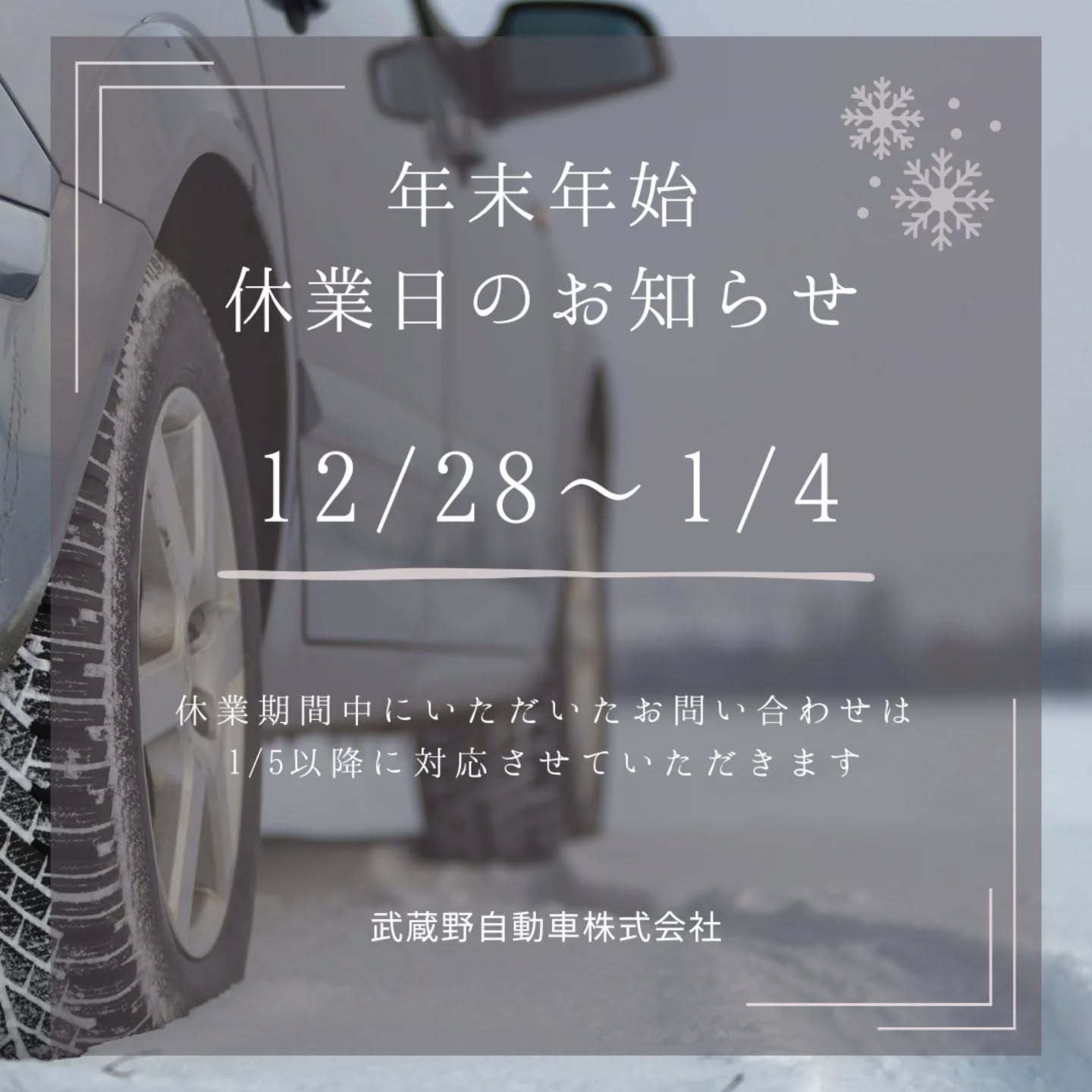 #年末年始休業のお知らせ #武蔵野自動車#自動車#車屋さん#カーショップ #全メーカー取扱#小平市#自動車修理#鈑金修理#自動車整備工場#自動車販売店#新車#中古車#自動車保険#損保ジャパン#あいおいニッセイ同和損害保険#車好きな人と繋がりたい#フォローよろしくお願いします#隣にカフェのある店 – Instagram